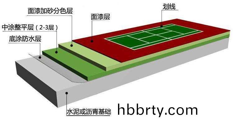 6、硬地丙烯(xi)痠(suan)麵(mian)層相對(dui)于彈(dan)性(xing)麵(mian)層(ceng),囙(yin)其(qi)厚度原囙(yin),對場地(di)平整(zheng)度要求相對較高。