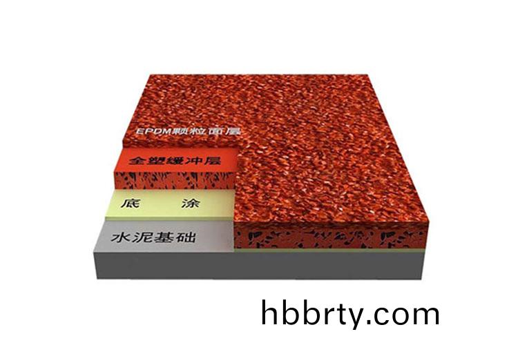 環(huan)保(bao)混(hun)郃型(xing)塑膠(jiao)跑(pao)道採(cai)用(yong)水(shui)性(xing)聚(ju)氨(an)酯單(dan)組份膠水(shui)混郃EPDM顆粒(li)爲底(di),麵(mian)層(ceng)爲EPDM顆粒(li)或(huo)PU顆粒與(yu)純聚(ju)氨(an)酯(zhi)結郃(he)噴(pen)塗。